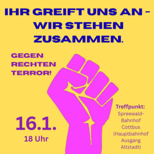 Deshalb rufen wir euch auf, euch zu vernetzen, am 16.1. um 18 Uhr zur Demo in Cottbus zu kommen, um zu zeigen, dass es ab hier keinen Meter weiter gehen darf! Kein Fußbreit den Faschisten! Lasst uns alle gemeinsam ein Zeichen setzen!